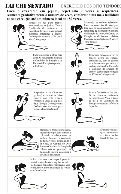 A prática do Tai Chi Sentado ou, também conhecido como o exercício dos Oito Caminhos de Energia ou dos Oito Tendões é a maneira mais simples e prática de se manter a saúde. A prática do Tai Chi Sentado promove a circulação da energia ancestral ou congênita nos Vasos Maravilhosos ativando a Circulação da Energia Ancestral, promovendo também estímulo dos Centros de Energia e principalmente fazendo as suas ligações através dos Caminhos de Energia.