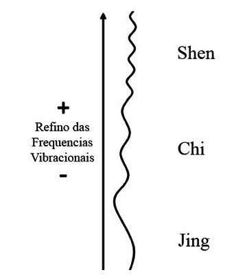 A imagem seguinte mostra como cada um dos três tesouros internos de Jing, Chi e Shen são simplesmente versões mais ou menos refinadas da mesma informação vibracional.