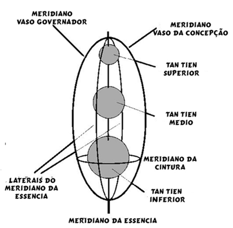 Dentro do sistema energético humano existem vários meridianos profundos que formam uma espécie de ‘gaiola’ energética. Esta gaiola é composta de vários ramos do meridiano de impulso (Chong Mai), o meridiano da cintura, o meridiano vaso governador e o meridiano vaso da concepção. A gaiola energética formada por esses caminhos energéticos é mostrada adiante.