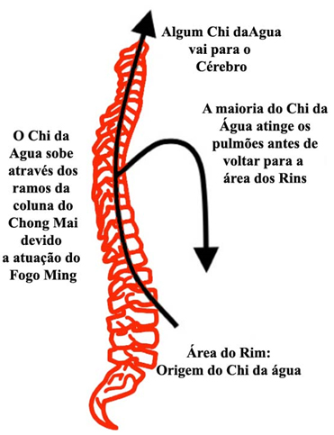 Como o microcosmo e o macrocosmo são um e o mesmo; o ciclo da energia da Água dentro do corpo se assemelha ao ciclo da água no ambiente externo. A energia da água se origina na área dos Rins dentro da gaiola energética. Como um lago parado, essa energia permanece adormecida até que a energia do Fogo Ming forneça calor. A energia da Água muda para ‘vapor’ que sobe ao longo da coluna através do meridiano Chog Mai. Uma vez que a energia da Água atinge o topo dos pulmões, ela é resfriada e começa a cair mais uma vez como chuva. A energia da Água desce através do corpo, fornecendo umidade e governando o aspecto Yin do corpo. Agora o ciclo recomeça. A imagem segunite mostra o movimento da energia da Água dentro da gaiola energética.